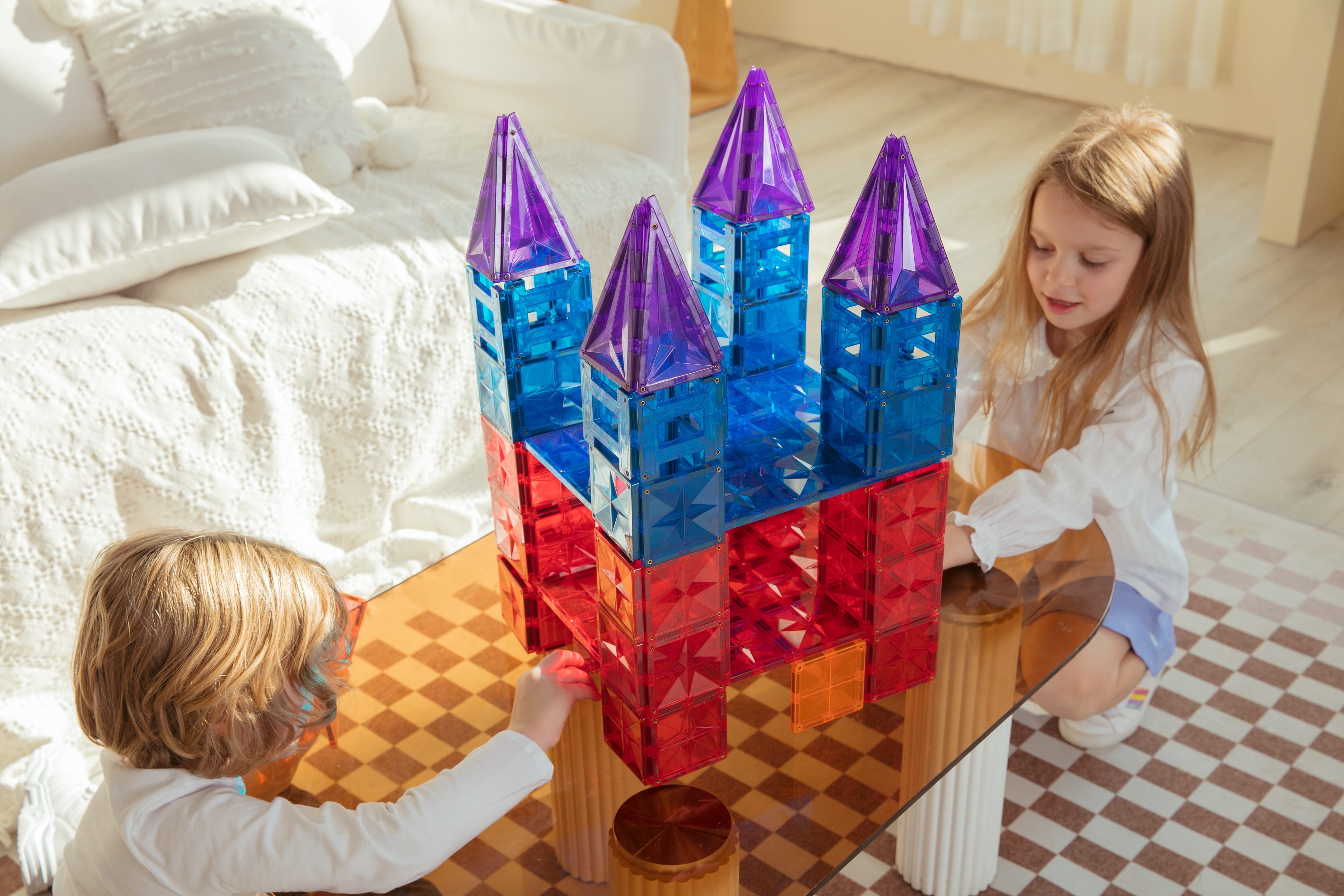 Our tiles feature stronger magnets and a unique Beveled Design, which allows for the construction of more ambitious, stable, and sizable projects. The beautiful star-shaped refraction and high transparency of the tiles ensure they remain bright and vivid. Made with non-toxic, BPA-free plastic, MegagonTiles are safe and durable, making them a trustworthy choice for parents and educators alike.